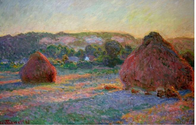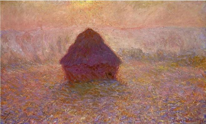 莫奈的绘画作品《干草垛》,用的就是色彩并置的技术。这种技术可以使观者获得色彩混合和震荡的独特的视觉感受。与先前古典主义那种追求精确逼真的绘画观念不同,以莫奈为代表的印象派画家强调瞬间的视觉印象,在他们的画作中,我们可以直观感受到光与影的流淌。印象派绘画吸引人的正是它的朦胧和色彩变化的微妙,倘若想在印象派绘画中寻找逼真的一面,那么就要远看。而当近看时,我们就能够观察到色点与色点并置而产生的混色效果。色彩并置法的使用,为整部画作营造出一种扑朔迷离的神秘色彩效果,也为观赏者提供了一种独特的审美享受。