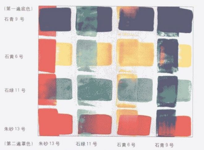 矿物颜料常常被应用在美术作品之中,画家将矿物颜料以种种技巧涂抹在画布之上,创造出一幅幅美丽的画作。而究其原理,当应用于美术作品中时,矿物颜料主要是靠胶将颜色定到画面。靠胶将颗粒与颗粒之间的接触点粘结在一起,期间留有空隙,透过这些空隙,颜色颗粒自身发出的屈折光与外部给予的反射光,还有空隙中透出的下一层颜色的折光,在相互交错中产生出一种透明与不透明夹杂的混合效果,这也是矿物颜料在运用中的魅力之所在。矿物颜料在绘画中的用色方法,正确的应该是从底层向表层由细粒子向粗粒子发展。越底层的颜色颗粒要略细,胶要略浓,越上层的颜色颗粒越粗,胶要略淡,这样才能使颜色颗粒达到最好的发色效果。否则,若颗粒与颗粒的排列较为混乱,光的折射在其中便不能得到最好的挥发,从而影响显色效果。