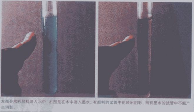 左图是水彩颜料溶入水中,右图是水中滴入墨水,有颜料的试管中能映出阴影,而有墨水的试管中不能产生阴影。